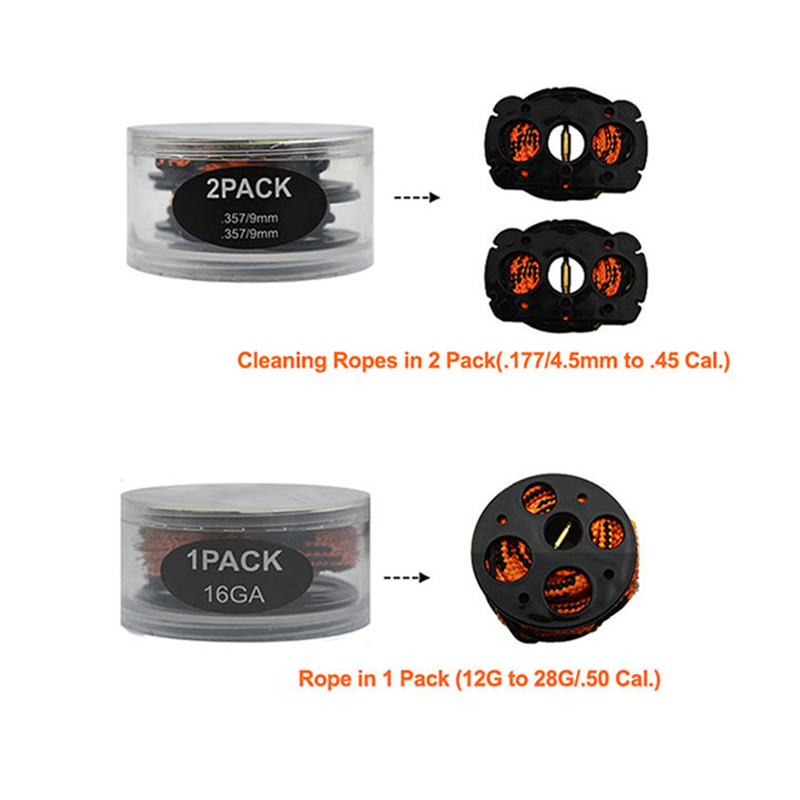 ● துப்பாக்கி சுத்தப்படுத்தும் கயிறுகள் இறுக்கமாக தைக்கப்படுகின்றன, எளிதில் உடைக்காது; செயற்கை இழை கயிறு கட்டப்பட்ட தூரிகை மூலம் துளைகளை விரைவாகவும் பயனுள்ளதாகவும் சுத்தம் செய்யலாம். காலிபர் எண் ஒவ்வொரு முனை நட்டிலும் லேசர் அச்சிடப்பட்டுள்ளது. கயிறுகள் மீண்டும் பயன்படுத்த துவைக்கக்கூடியவை.