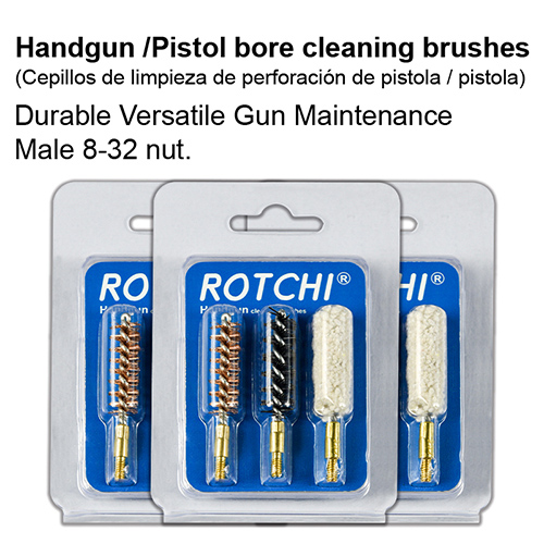 கைத்துப்பாக்கி துளை சுத்தம் செய்யும் தூரிகை 3-இன்-1 செட், கொப்புளம் மற்றும் அட்டை தொகுப்பு. கிடைக்கும் அளவுகள்: .22, 9mm, .40, .45cal.