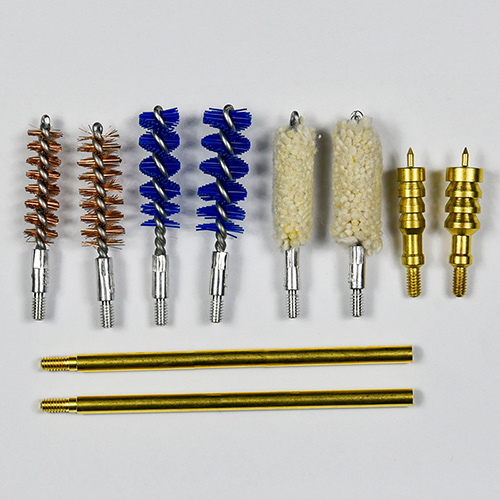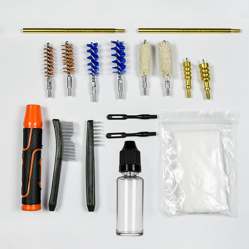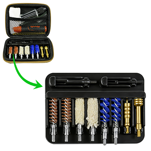 கைத்துப்பாக்கி சுத்தம் செய்யும் கருவியில் 2 அளவுகள் உள்ளன (9 மிமீ & .45 கலோரி.). OX துணி பூசப்பட்டது ஜிப் உடன் PVC கேஸ். பித்தளை தூரிகைகள், பருத்தி துடைப்பான்கள், நைலான் தூரிகைகள், பித்தளை ஜாக்ஸ், 2 தண்டுகள். தேர்வுகளுக்கு மணல் மற்றும் கருப்பு நிறம்.