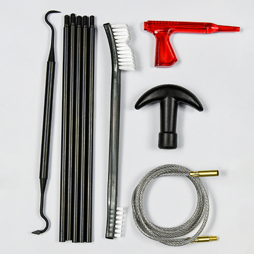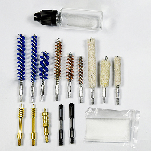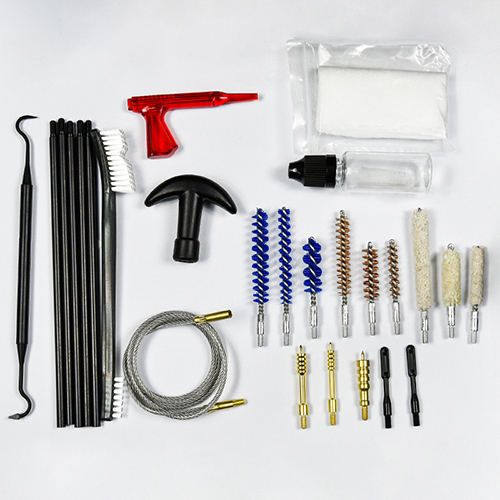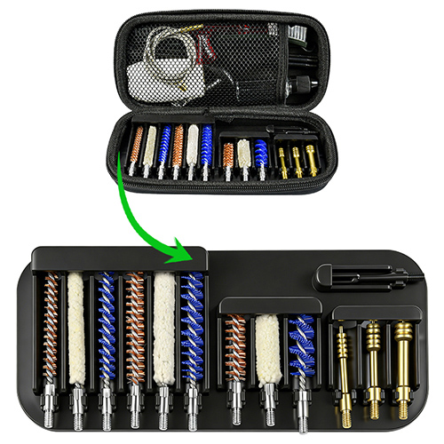 துப்பாக்கி மற்றும் கைத்துப்பாக்கி சுத்தம் செய்யும் கருவியில் 3 அளவுகள் உள்ளன (.22cal. .30cal. 9mm). OX துணி ஜிப் உடன் பூசப்பட்ட PVC கேஸ். பித்தளை தூரிகைகள், காட்டன் மாப்ஸ், நைலான் பிரஷ்கள், பித்தளை ஜாக்ஸ், 5 தண்டுகள் 1 கால்பே. தேர்வுகளுக்கு மணல் மற்றும் கருப்பு நிறம்.